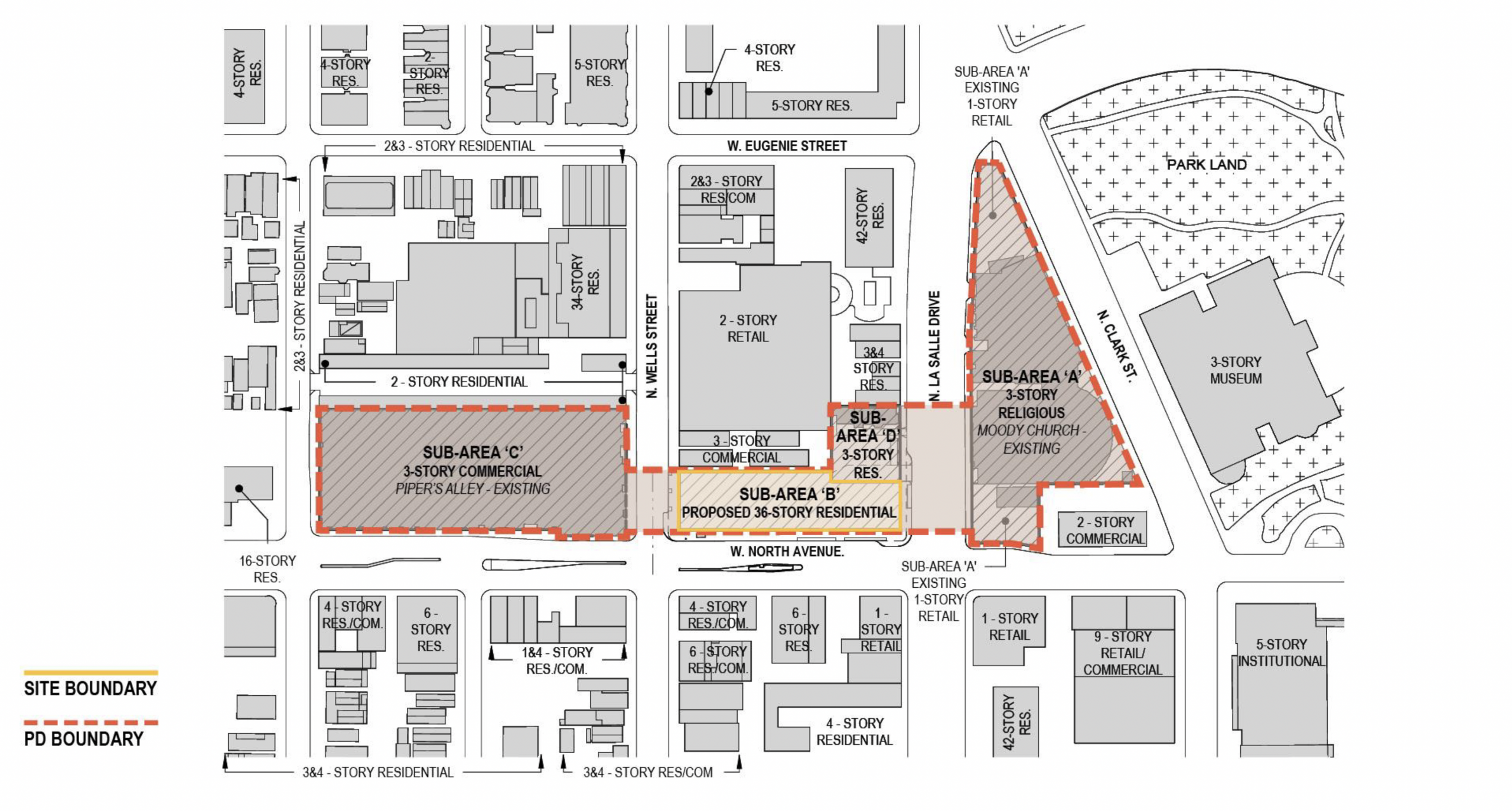 Old Town Canvas is mixed-use development to be located at 1610 N. LaSalle Drive in historic Old Town. The 36-story Old Town Canvas tower will include 349 apartments and up to 285 parking spaces. It is the first phase of what will become a mega development and rezoning of more than one million square feet, impacting far more than one parcel, including Piper’s Alley and Moody Church parcels.